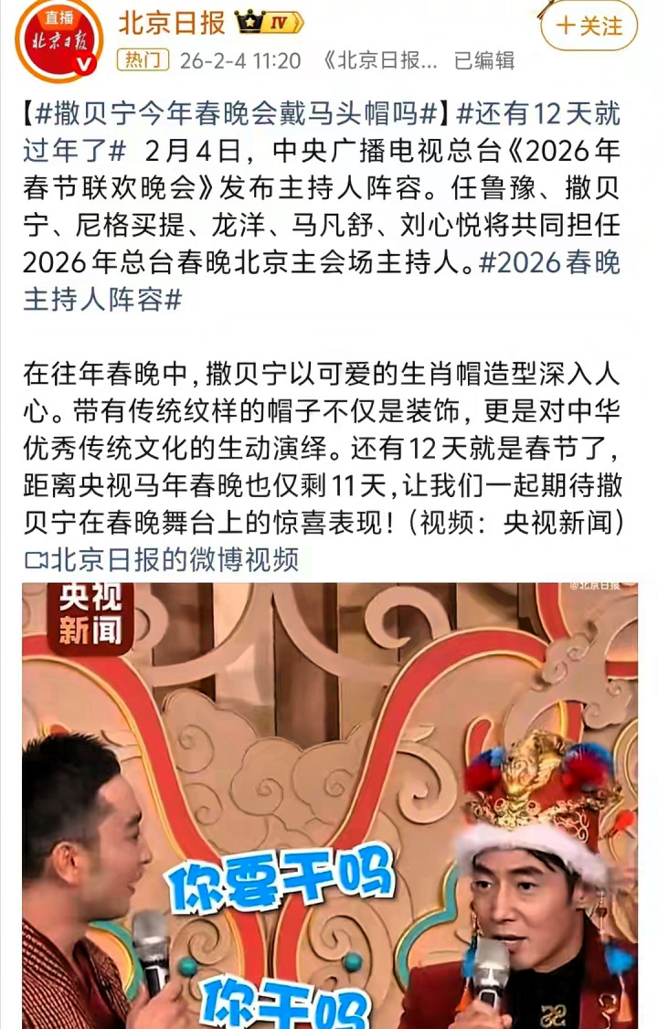 2月4日,春晚主持人阵容正式官宣。主会场的三男三女组合,撒贝宁和尼格买提已是“常驻嘉宾”,一红一蓝的搭配十分吸睛,据说小撒还会戴着生肖帽带来特别表演。C位依旧是稳重的任鲁豫,龙洋、马凡舒都是老熟人,而新加入的刘心悦,则成了大家关注的焦点。